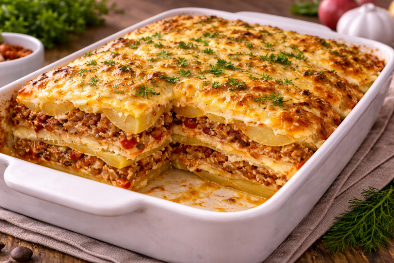 Нежные слои картофеля, сочный мясной соус, сливки и тянущийся сыр — эта лазанья покоряет с первого кусочка. Сверху румяная корочка, внутри — идеальные слои, аромат чеснока и томатов, как в хорошем итальянском ресторане. Готовится просто, из доступных продуктов, а выглядит как блюдо из кафе. При этом себестоимость порции — минимальная, а удовольствие — максимальное.