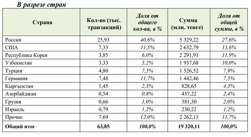 Больше всего денег в Казахстан отправили из России – 5,3 млрд тенге, США – 2,6 млрд тенге и Южной Кореи – 2,3 млрд тенге.