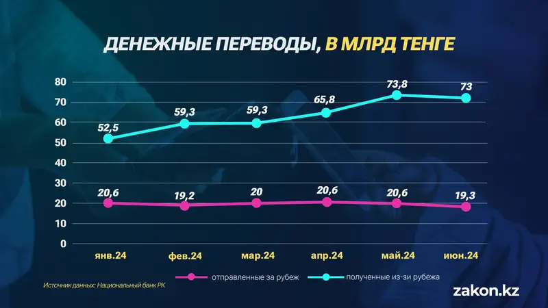 В Казахстан в июне 2024 года было направлено 63,8 тыс. транзакций на сумму 19,3 млрд тенге. В сравнении с маем 2024 года количество полученных денежных переводов также сократилось на 13,9%, объём операций уменьшился на 6,2%.